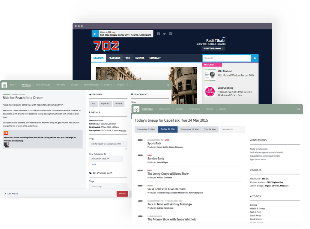 Over the course of several years we replaced Primedia Broadcasting's expensive licensed software with purpose built technology and a suite of tools to manage everything from the running order of 702's to the websites that serve millions of pages a month. Now, when big news breaks, their websites don't.